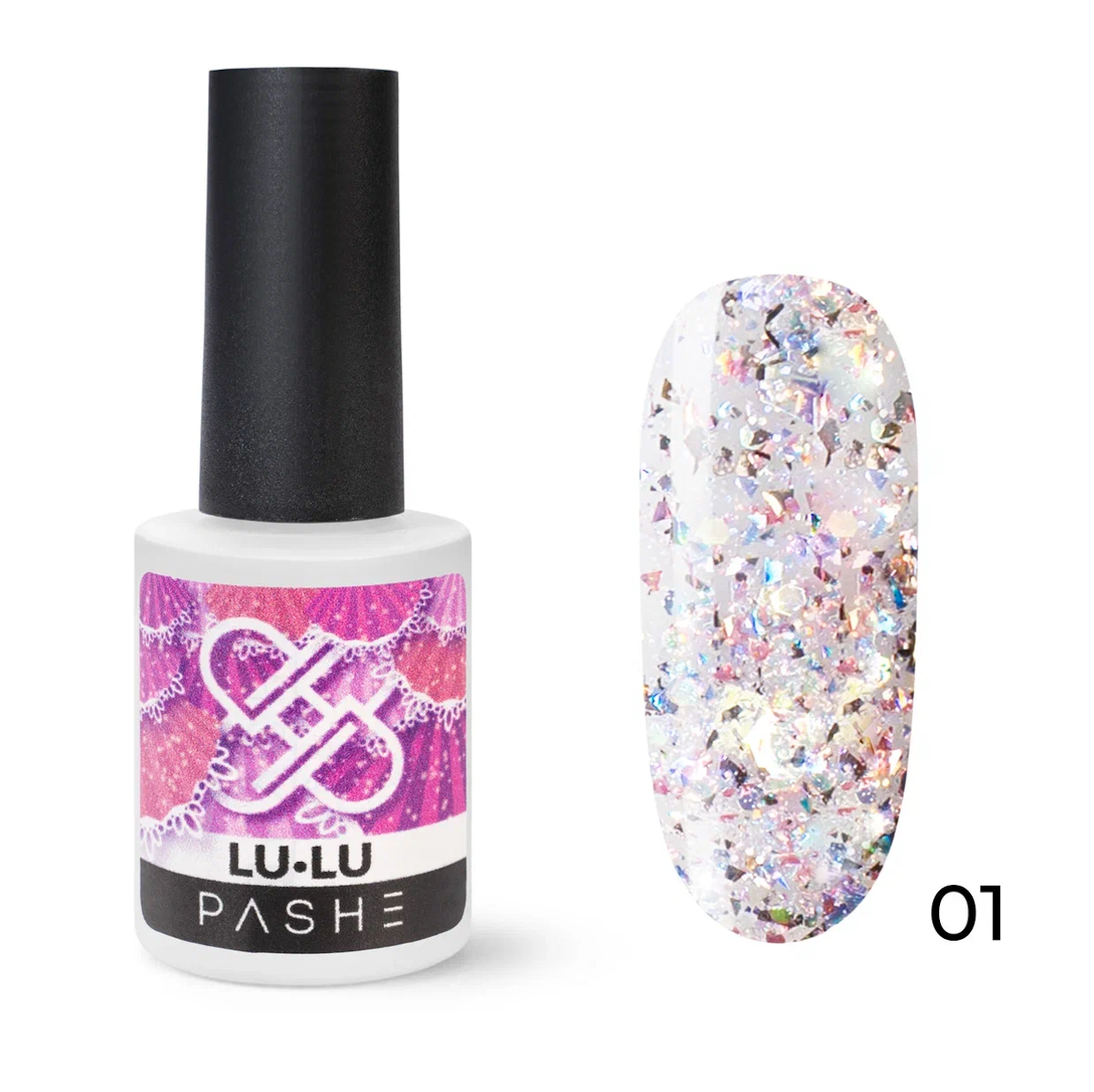 - PASHE Гель-лак LU LU с голографическим глиттером №01 - фея Драже, 9 мл.