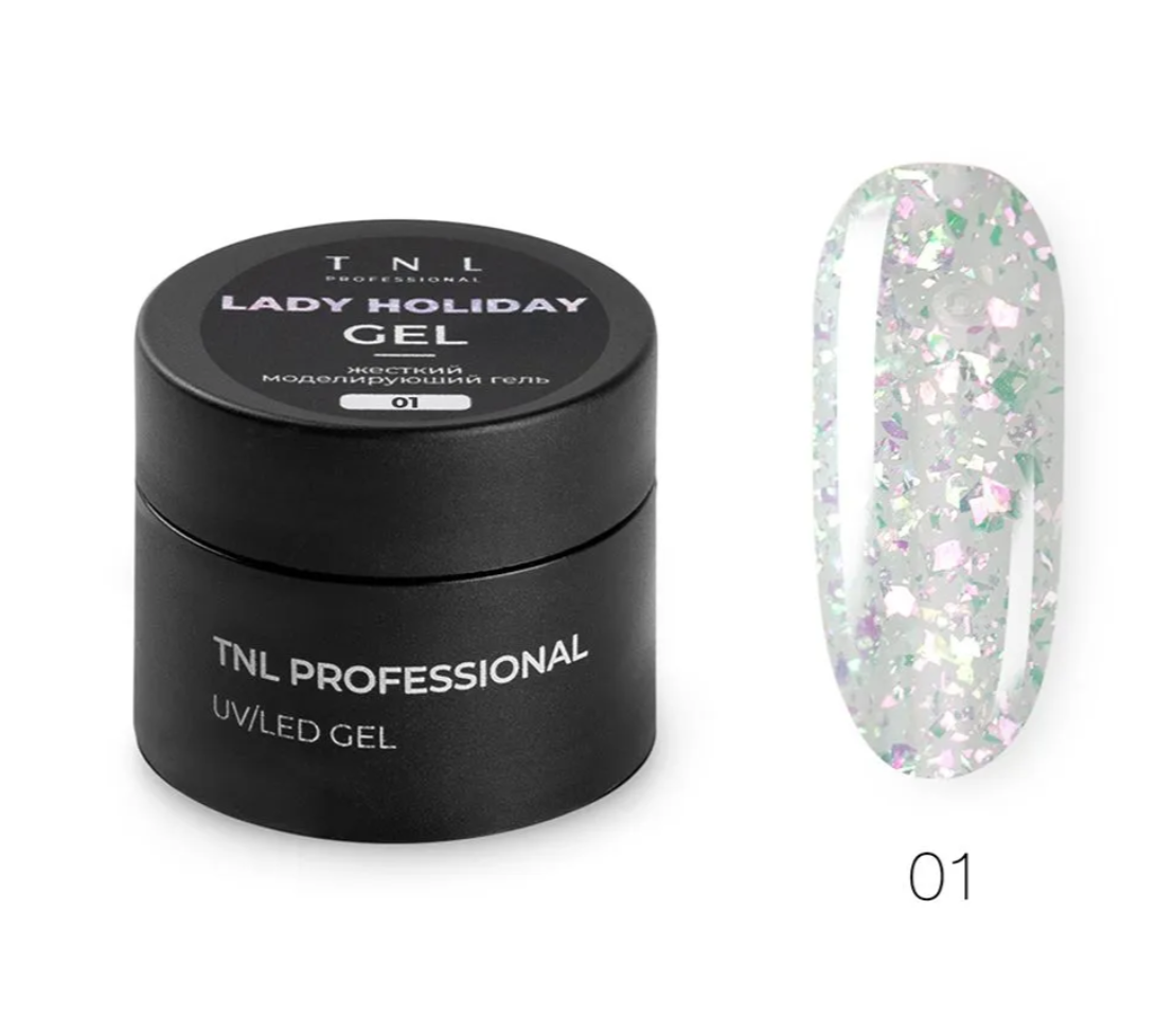 TNL Жесткий гель для наращивания Lady Holiday с хлопьями юки №01 - Идеальный материал для создания качественного покрытия с готовым дизайном.