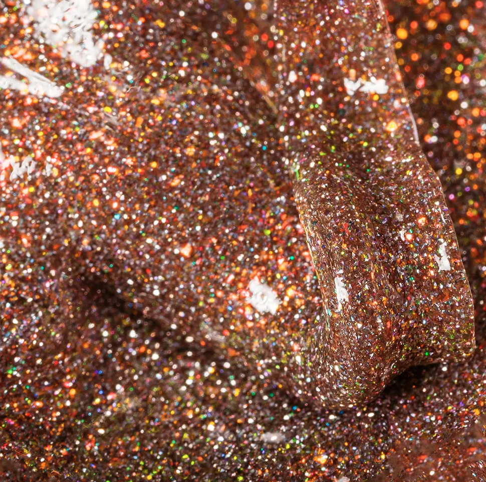 Микс частицы рефлективного пигмента и хлопьев Юки в цветной витражной основе сохраняет интенсивность блеска на протяжении всего срока носки.