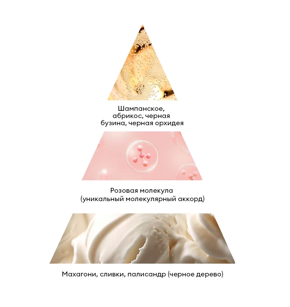 Базовые ноты взбитых сливок, черного дерева и махагони создают мягкий и обволакивающий шлейф, делая аромат одновременно легким и чувственным. Несмотря на свою яркость, аромат не перегружен сладостью.