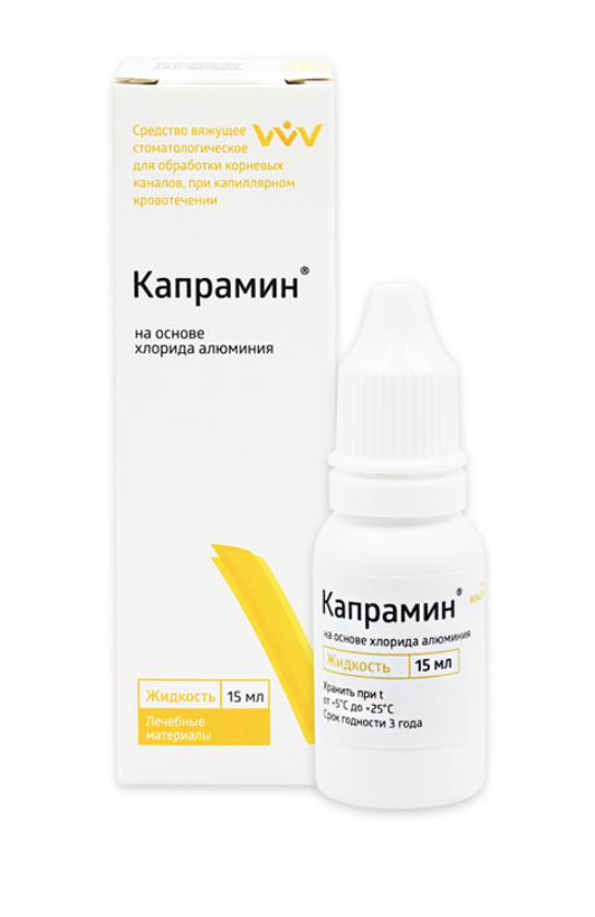 ВЛАДМИВА Капрамин жидкость на основе хлорида алюминия - Применяется как гемостатическое средство при капиллярном кровотечении из десны, для обработки зубных лунок и после прямого снятия слепков, для ретракции десны, при снятии камней, а также для обработки корневых каналов при кровотечении из канала.