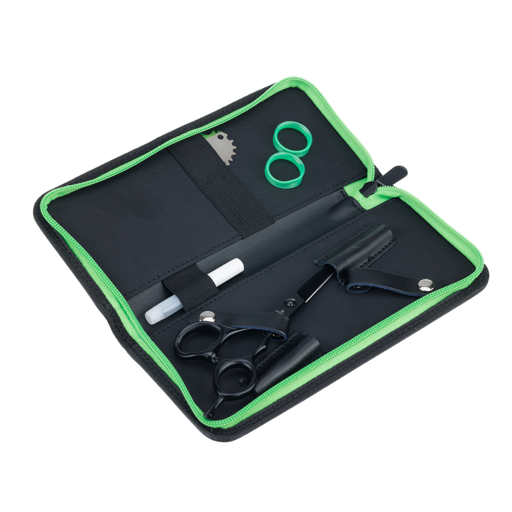Ножницы имеют конвекционную заточку с углом 42°, твердость по Роквелу 55-57 HRC, дополнительные сменные кольца салатового цвета.