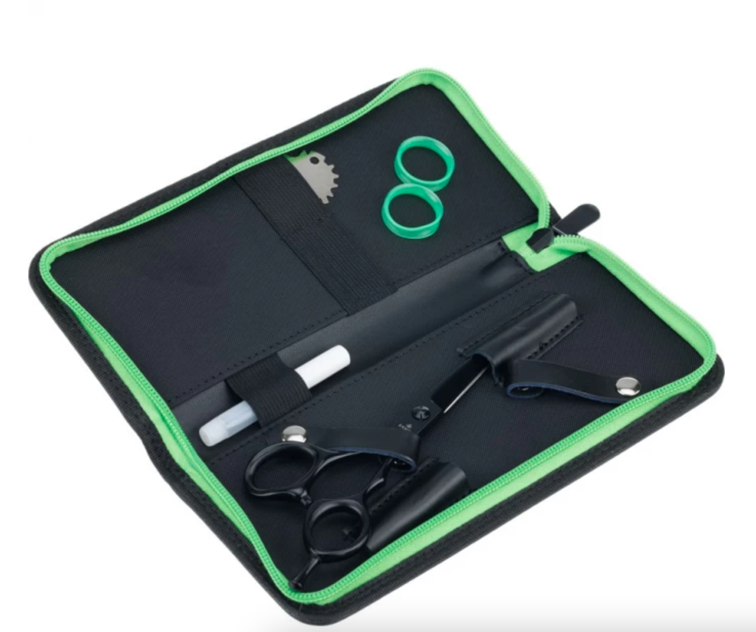 Изготовлен из качественной искусственной кожи. Отлично подойдет для хранения и переноски любых парикмахерских ножниц. Оригинальный футляр выполнен в практичном черном цвете с молнией салатового цвета. Чехол имеет 2 крепления для ножниц, крепления-резинки для 2 аксессуаров, а также крепление-резинку для тюбика с маслом.