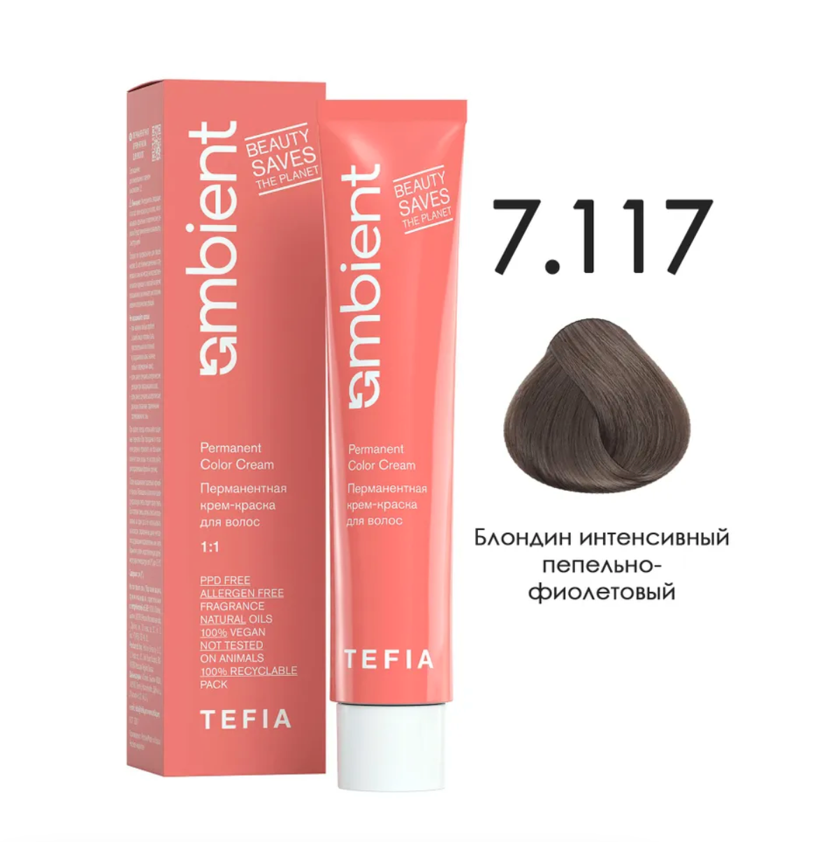 - TEFIA AMB Крем-краска 7.117 Блондин интенсивный пепельно-фиолетовый, 60 мл.