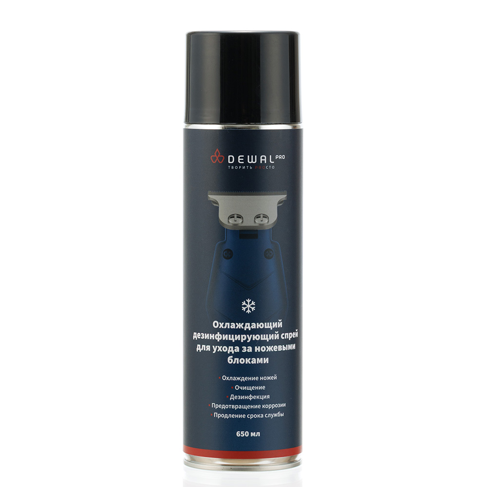 Охлаждающий дезинфицирующий спрей по уходу за ножевыми блоками DEWAL PRO - создан специально для бережного и эффективного ухода за лезвиями и рабочими поверхностями профессиональных машинок для стрижки волос.