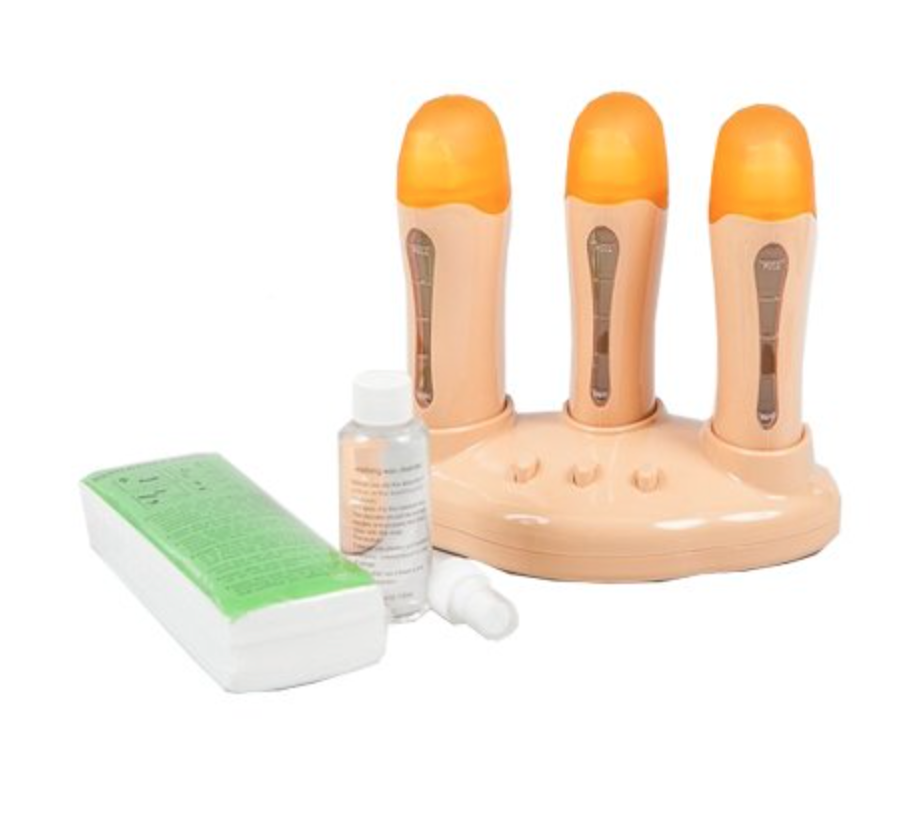 Этот комплект состоит из трех воскоплавов на единой подножке, имеется окошко для определения уровня воска, три кассеты с воском и полоски для депиляции.