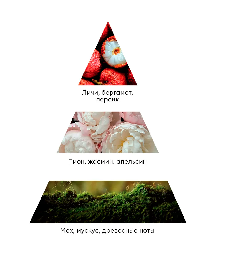 Вдохновляющее сочетание нежности пиона переплетается с сочной сладостью личи и мягким шлейфом мускуса, создавая лёгкий, свежий и изысканный аромат.