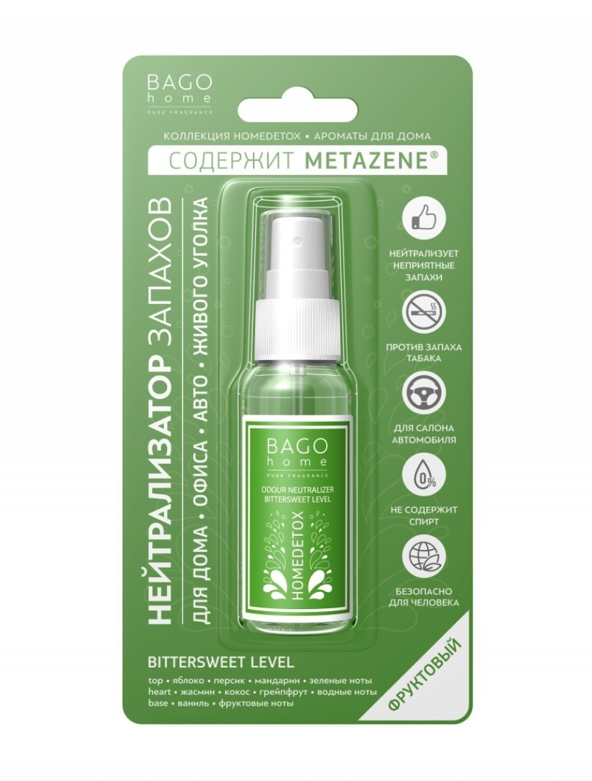 BAGO home Спрей ароматический Кисло-сладкий детокс - Свежий фруктово-цветочный аромат с сочным зеленым яблоком, изысканным жасмином в водных тонах и сладким шлейфом из тропической ванили.