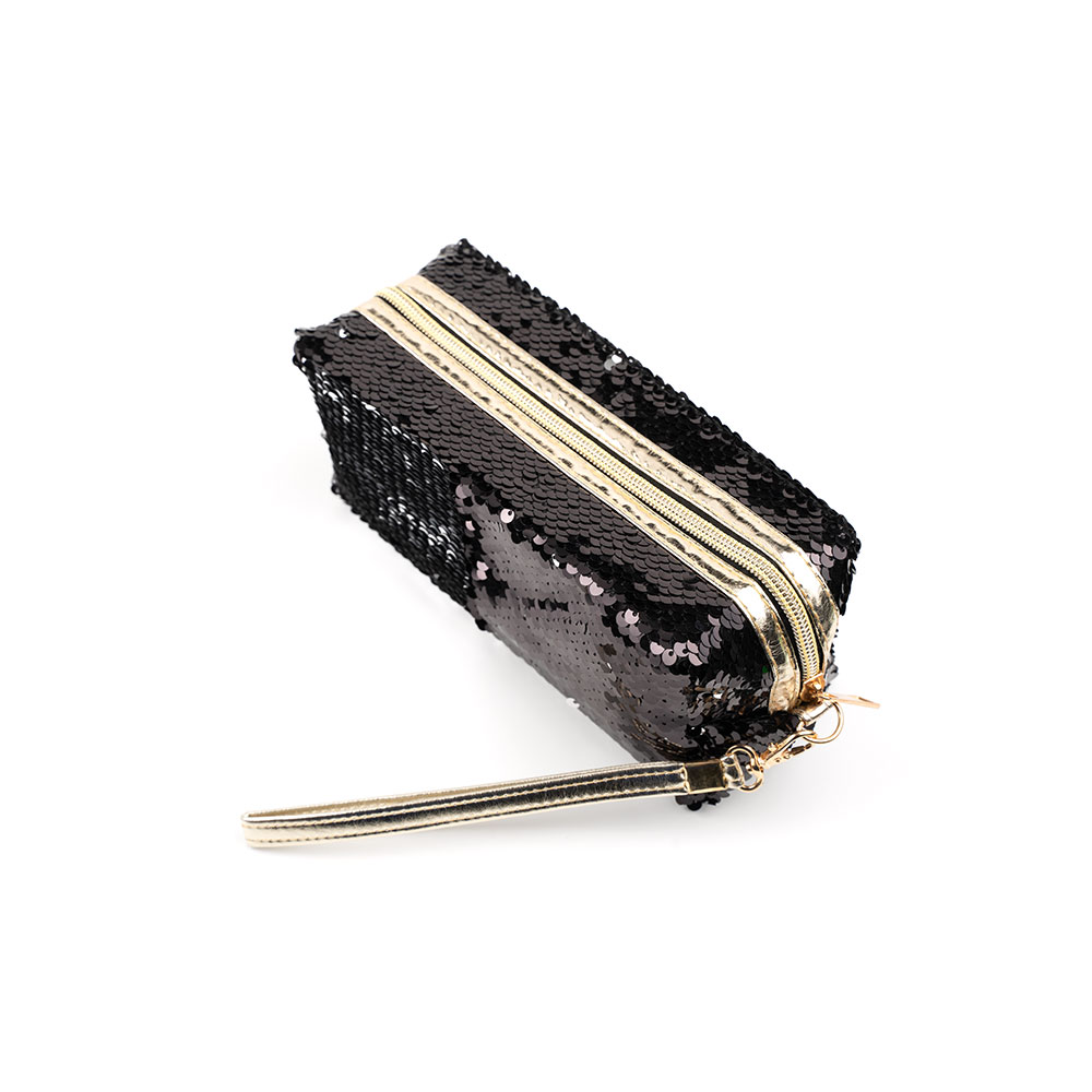 Вместительный и при этом компактный пенал на молнии предназначена для упорядочивания и удобного хранения аксессуаров, косметики, важных мелочей. Изготовлен из текстиля, декорирован разноцветными пайетками, которые можно перевернуть для изменения расцветки аксессуара.