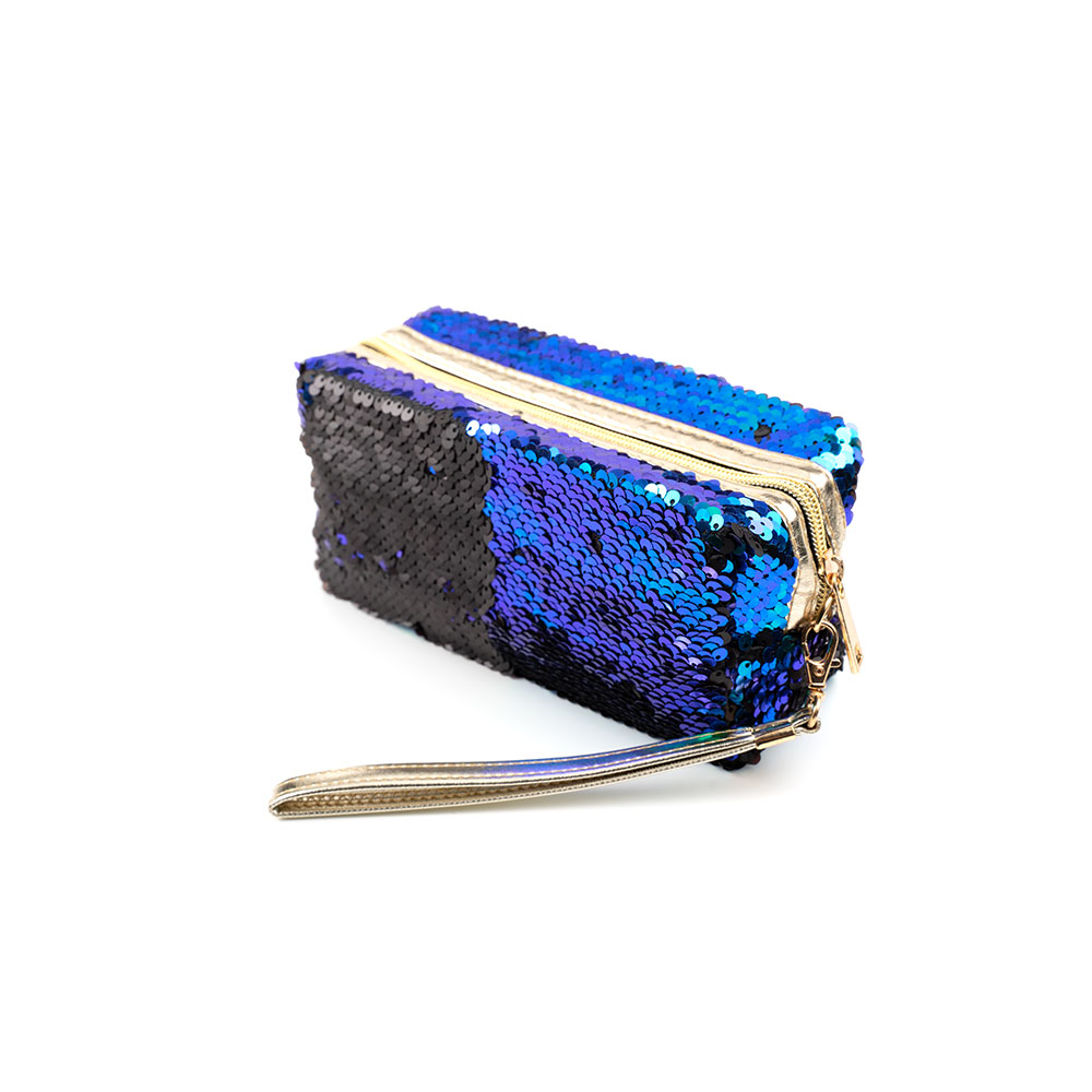 Вместительный и при этом компактный пенал на молнии предназначена для упорядочивания и удобного хранения аксессуаров, косметики, важных мелочей. Изготовлен из текстиля, декорирован разноцветными пайетками, которые можно перевернуть для изменения расцветки аксессуара.