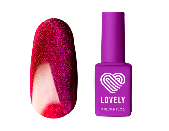 С жемчужным эффектом "Кошачий глаз". Мягкий, не растекается, не выгорает. Содержит светоотражающие частицы. Самовыравнивающееся покрытие. Стойкое покрытие от 3 до 5 недель без потери глянца и качества цвета. Легко снимается с помощью жидкости Remover от Lovely.