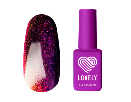 С жемчужным эффектом "Кошачий глаз". Мягкий, не растекается, не выгорает. Содержит светоотражающие частицы. Самовыравнивающееся покрытие. Стойкое покрытие от 3 до 5 недель без потери глянца и качества цвета. Легко снимается с помощью жидкости Remover от Lovely.