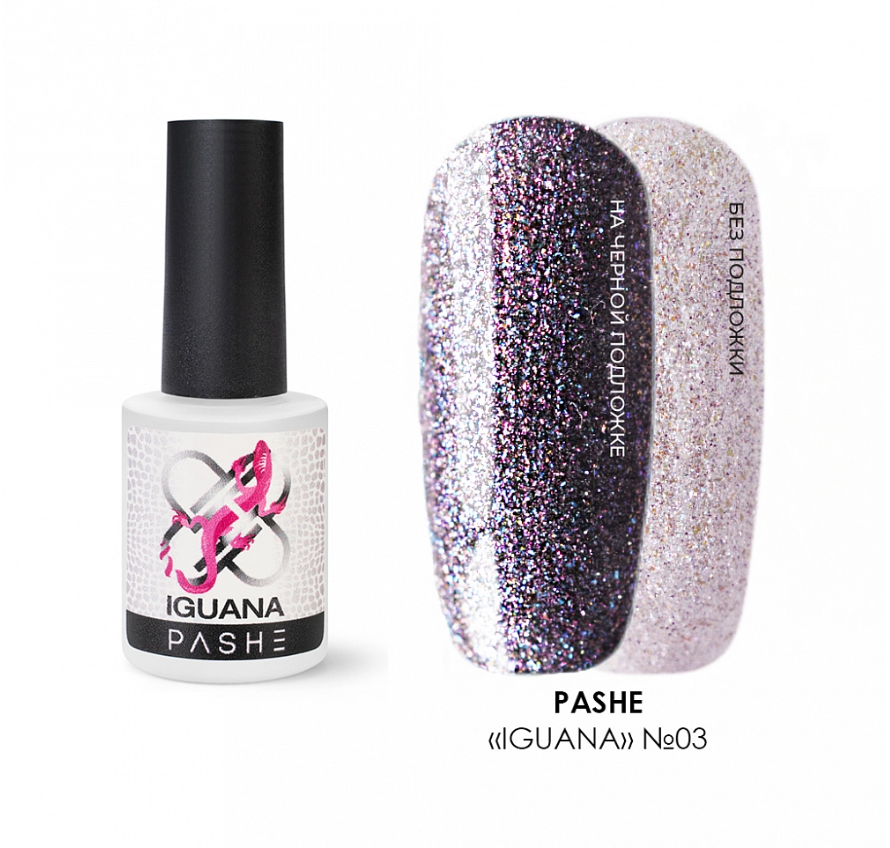 Гель-лак хамелеон PASHE Iguana со светоотражающими частицами помогает создать нежный сияющий маникюр, сохраняет глубину мерцания до 4 недель.