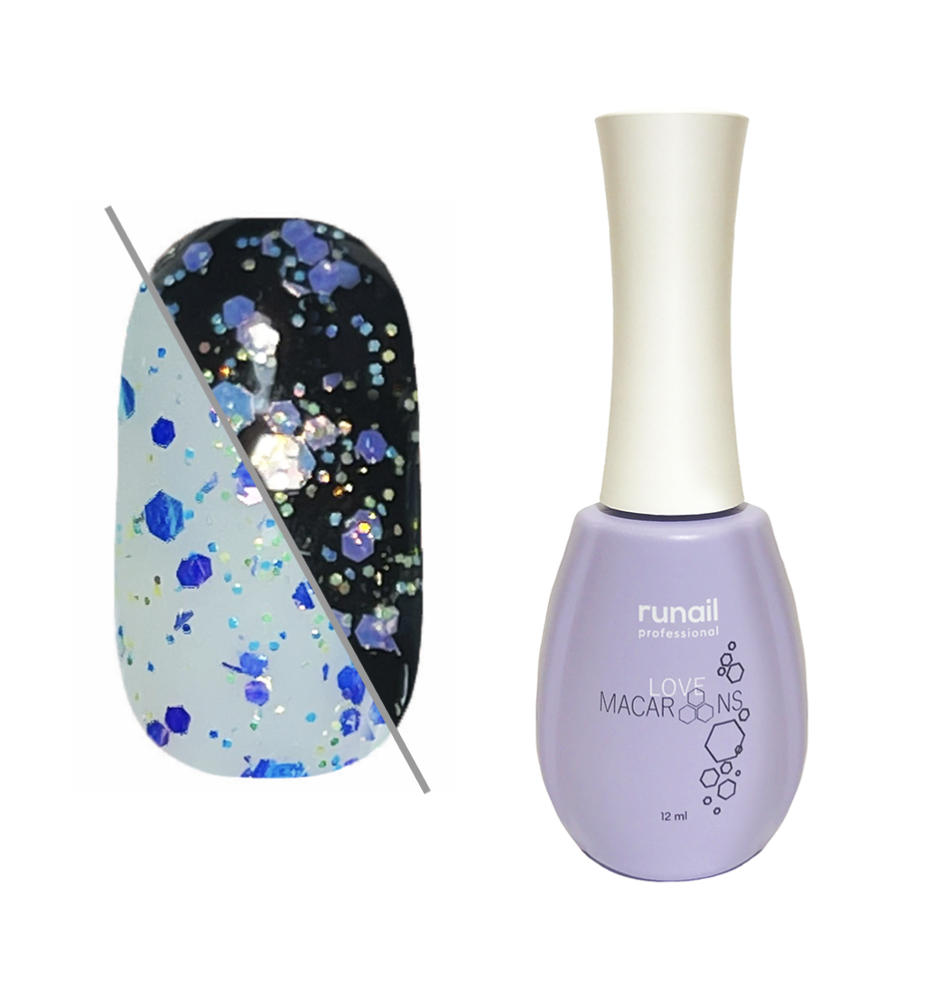 RuNail Гель-лак Macaroons - Прозрачный гель-лак с разноцветными блестками и голографическими шестигранниками разного размера.