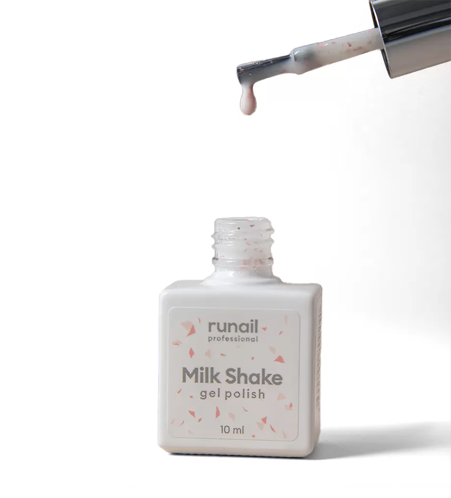 RuNail Гель-лак с вкраплениями цветной потали Milk Shake - в трендовом молочном оттенке имеет легко контролируемую текстуру, которая позволит сделать как актуальный однослойный полупрозрачный маникюр, так и качественный яркий мерцающий дизайн с 3D-эффектом.