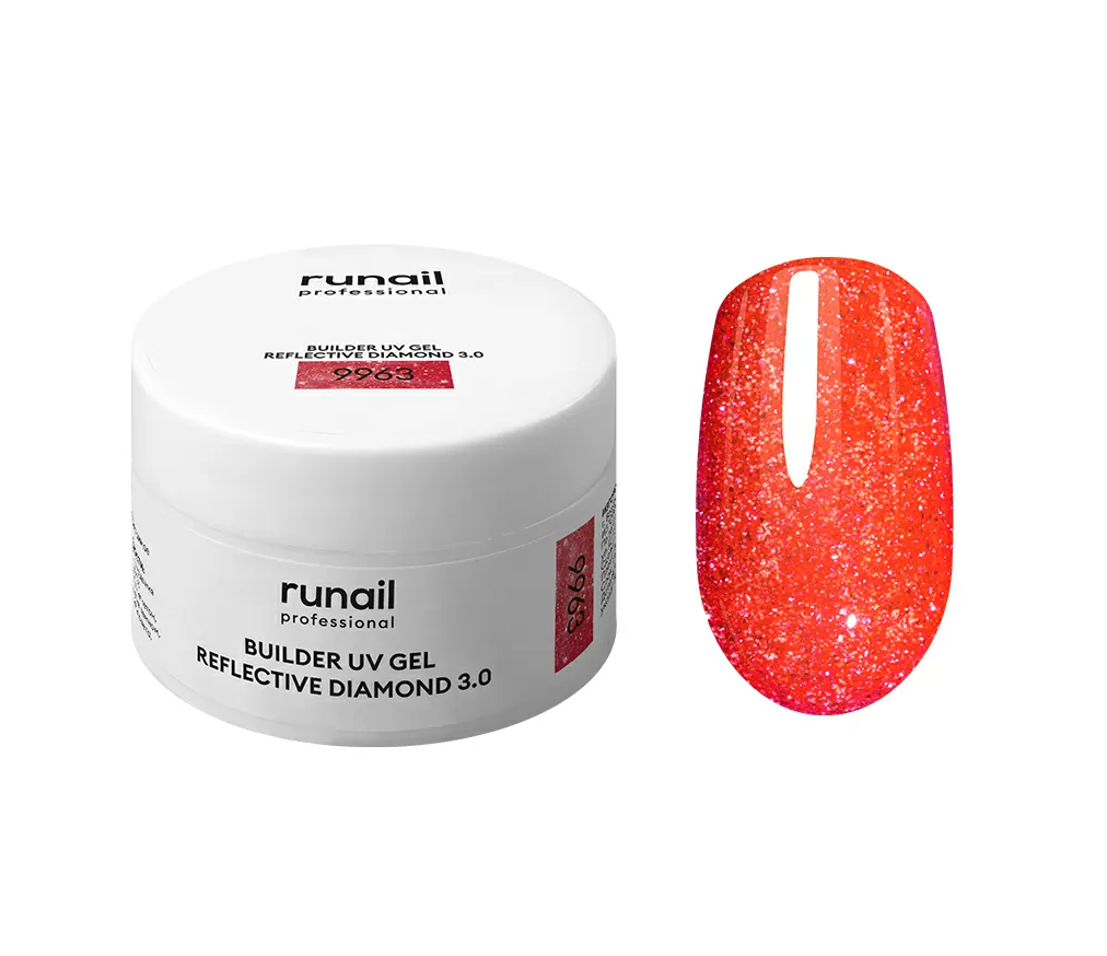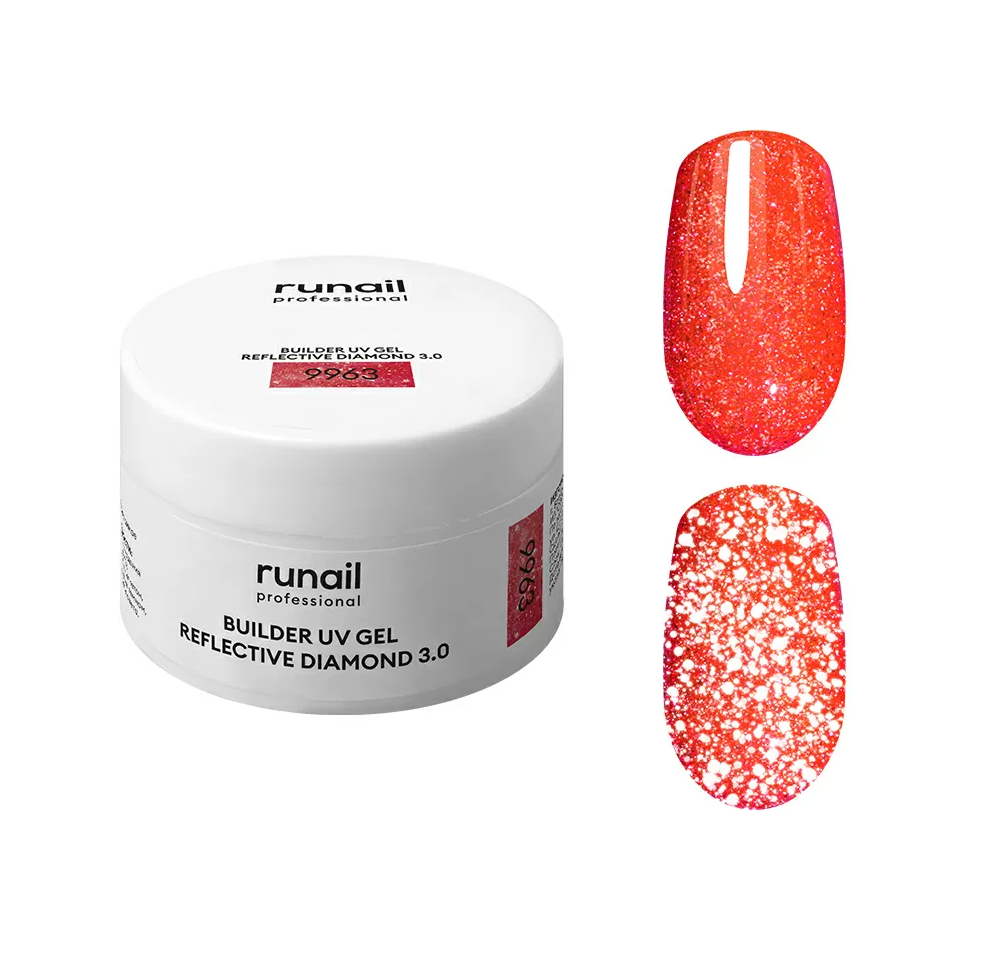 Runail Моделирующий УФ-гель светоотражающий REFLECTIVE DIAMOND 3.0 - в неоново-оранжевом оттенке с отражающими частицами и хлопьями юки - это идеальный выбор для создания уникального и эффектного дизайна прямо на этапе моделирования.