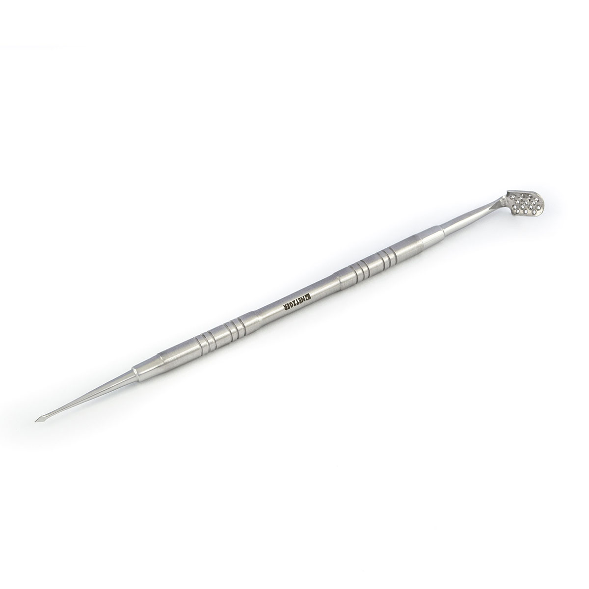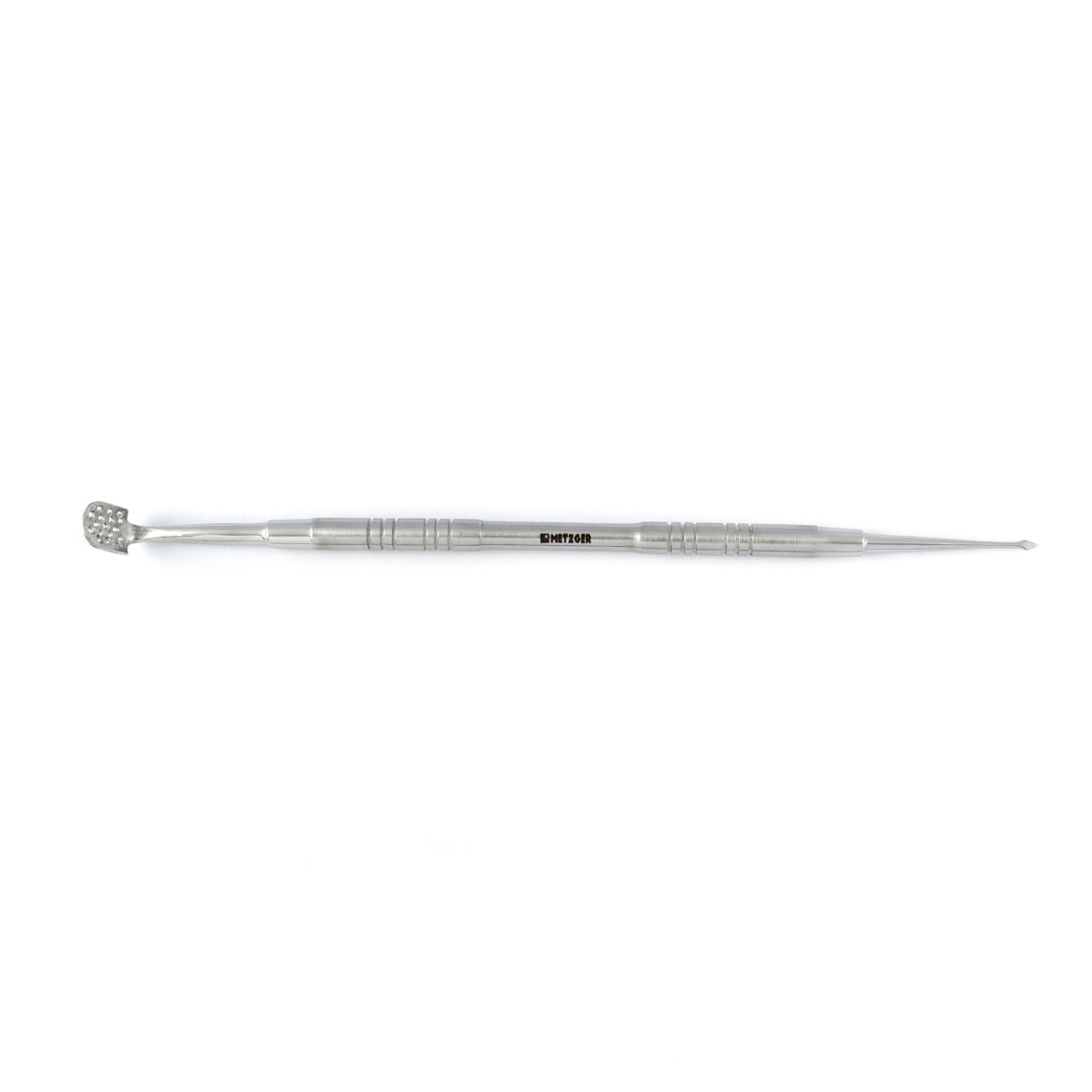 Из инструментальной нержавеющей стали с рифленой круглой ручкой. Представляет собой профессиональный двусторонний инструмент для косметологических процедур, где с одной стороны расположено остроконечное копье с хирургической заточкой для прецизионного вскрытия закрытых комедонов и милиумов, а с другой - перфорированная ложка диаметром с 17 микроотверстиями, расположенными в шахматном порядке для эффективного дренирования и вакуумной экстракции содержимого пор.