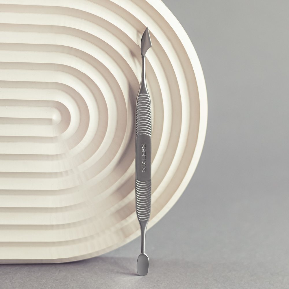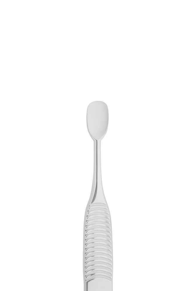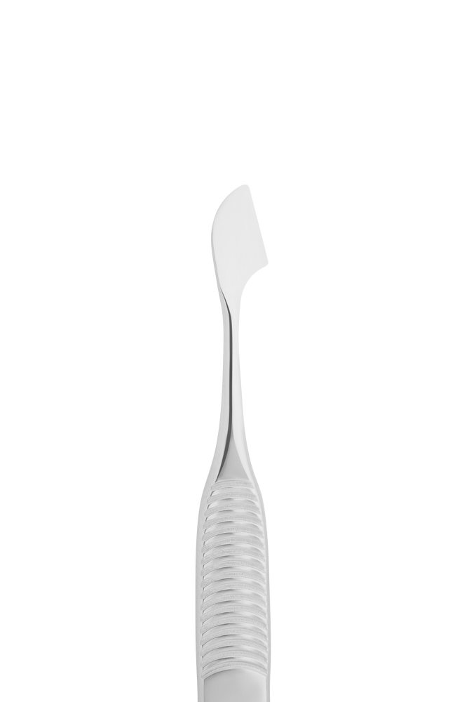 Имеет закругленные кромки и заостренную рабочую часть, которые легко удаляют кутикулу и не травмируют ногтевую пластину. Для удобства использования предусмотрена рельефная поверхность лопатки, исключающая соскальзывание пальцев.
