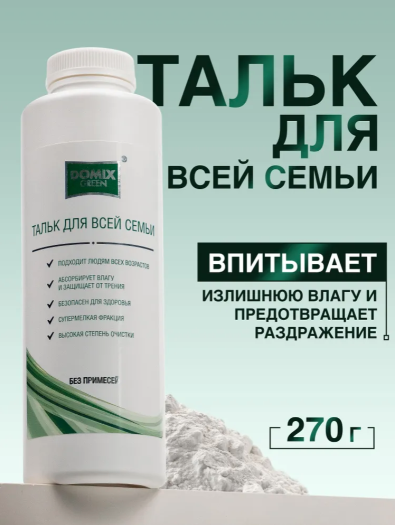 Domix Green Тальк для всей семьи - Высокоочищенный тальк фармакопейного качества абсорбирует излишки влаги, обеспечивая коже сухость, мягкость и комфорт.