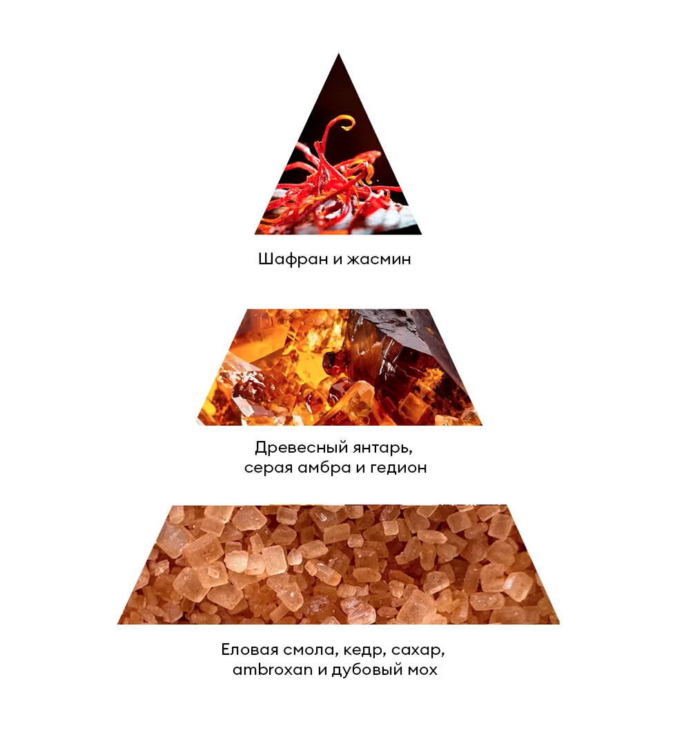 В сердце аромата звучит древесный янтарь, добавляющий мягкости и глубины.