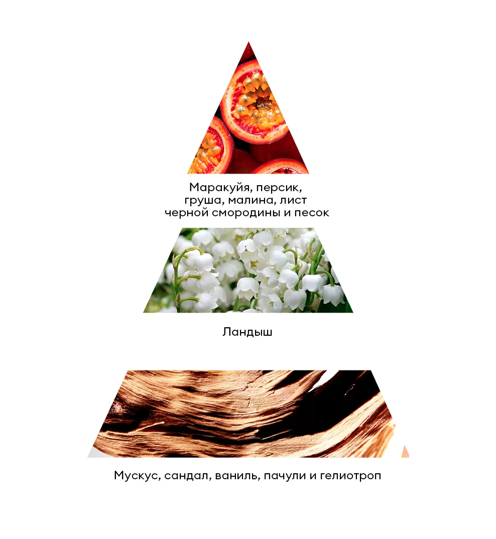 Он открывается сочными нотами маракуйи, персика, малины и чёрной смородины, дополненными аккордами мускуса, гелиотропа, сандала, пачули и ванили, которые создают глубокий и обволакивающий шлейф.