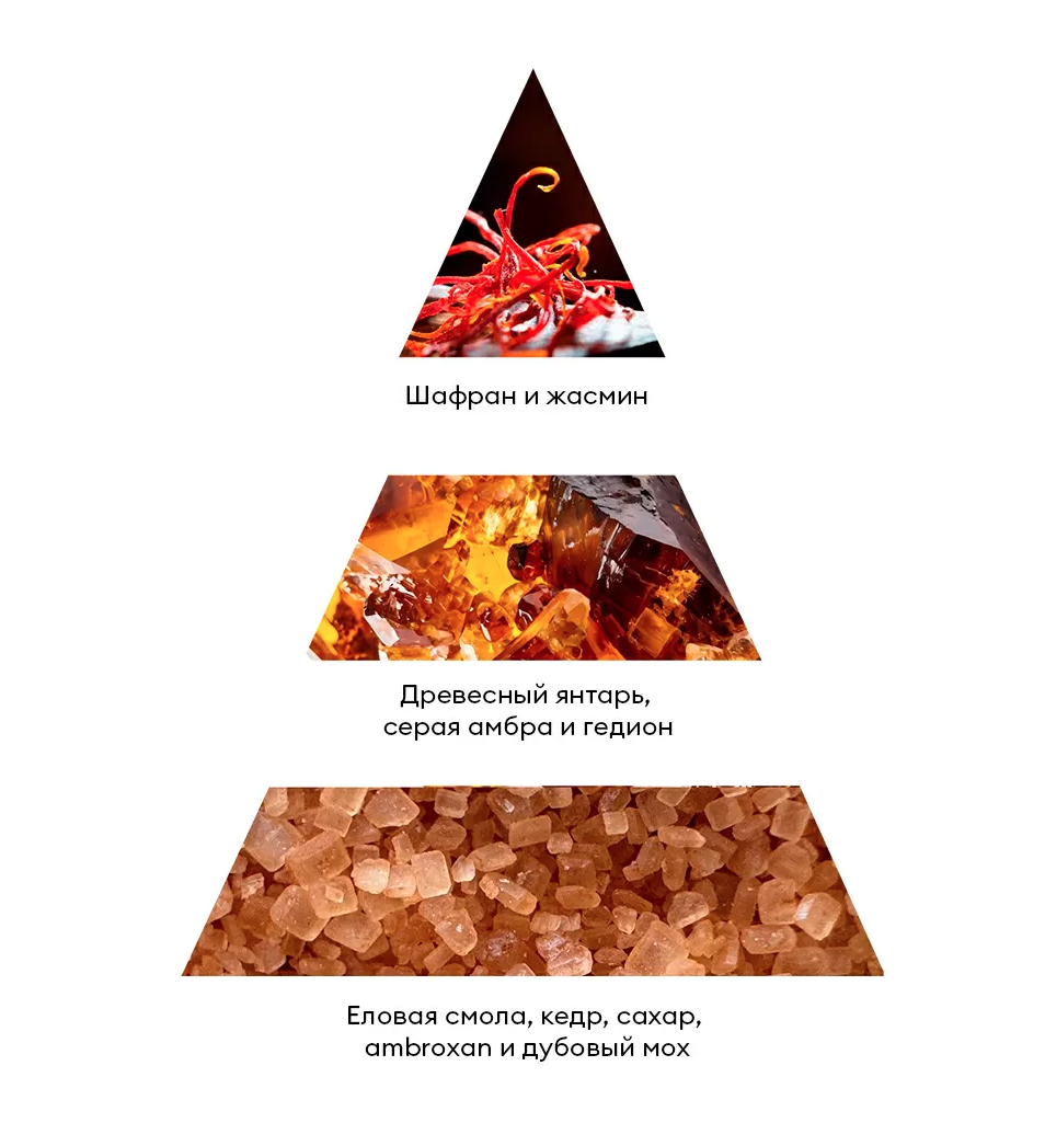 В сердце аромата звучит древесный янтарь, добавляющий мягкости и глубины.