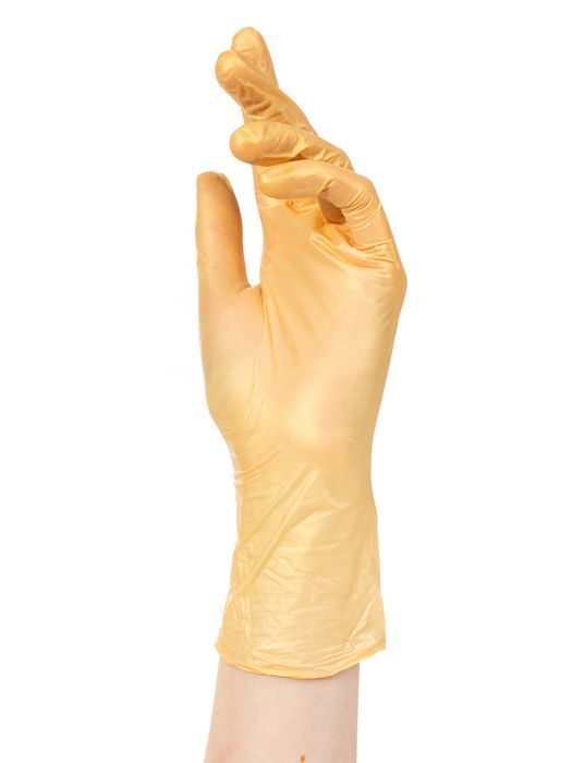 Adele Перчатки нитриловые Золото - изготавливаются из нитрильного (искусственного) каучука, обладает высокой эластичностью и прочностью, устойчив к воздействию кислот, химических веществ, переносит высокие температуры.
