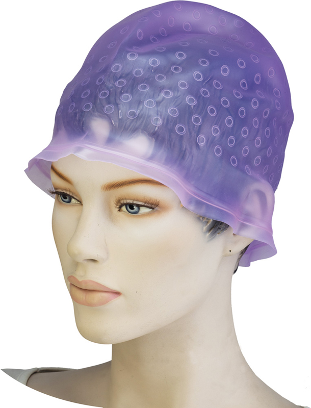 Выполнена из высококачественного силикона фиолетового цвета. С помощью специального приспособления - крючка пряди вытаскивают через отверстия в шапочке и окрашивают в нужный цвет. Шапочку можно использовать как в салоне красоты, так и в домашнем обиходе.