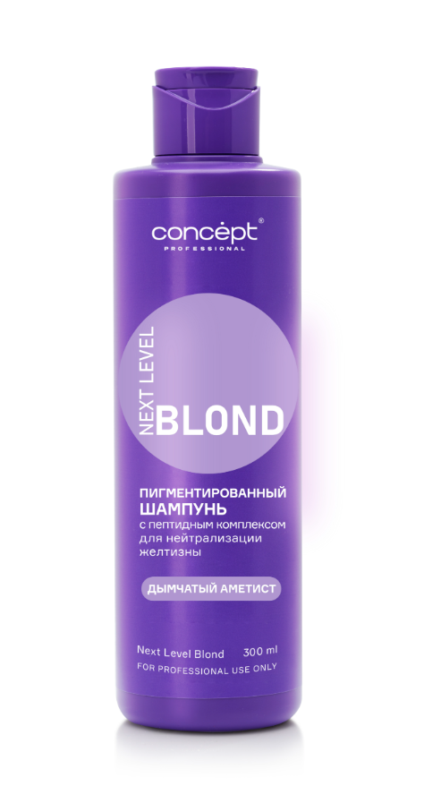 Концепт NEXT LEVEL BLOND Шампунь с пептидным комплексом для нейтрализации желтизны Дымчатый аметист - Уникальная формула шампуня нейтрализует нежелательный желтый оттенок на обесцвеченных и осветленных волосах, обеспечивая холодный лавандовый оттенок блонда, свежесть и блеск осветленным и обесцвеченным волосам.