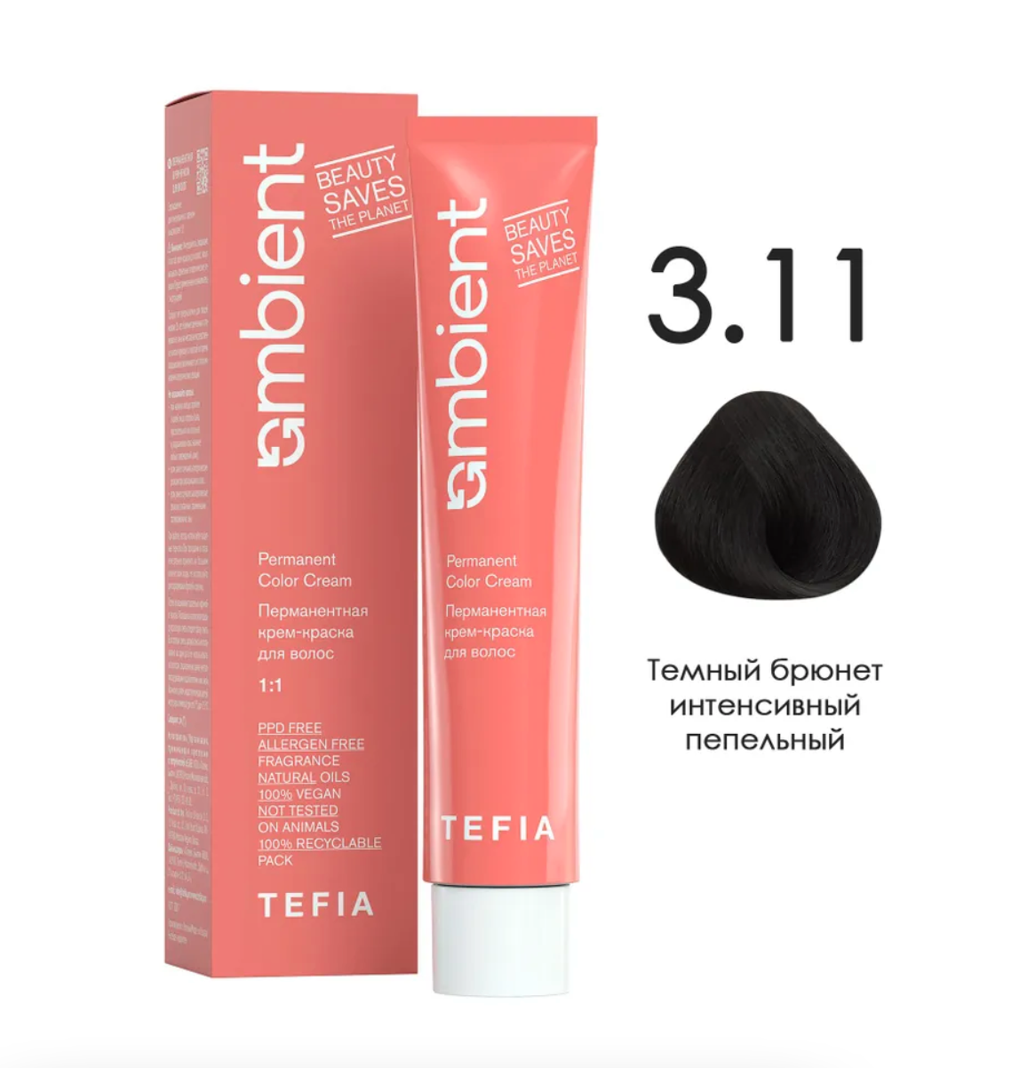 - TEFIA AMB Крем-краска 3.11 Темный брюнет интенсив. пепельный, 60 мл.