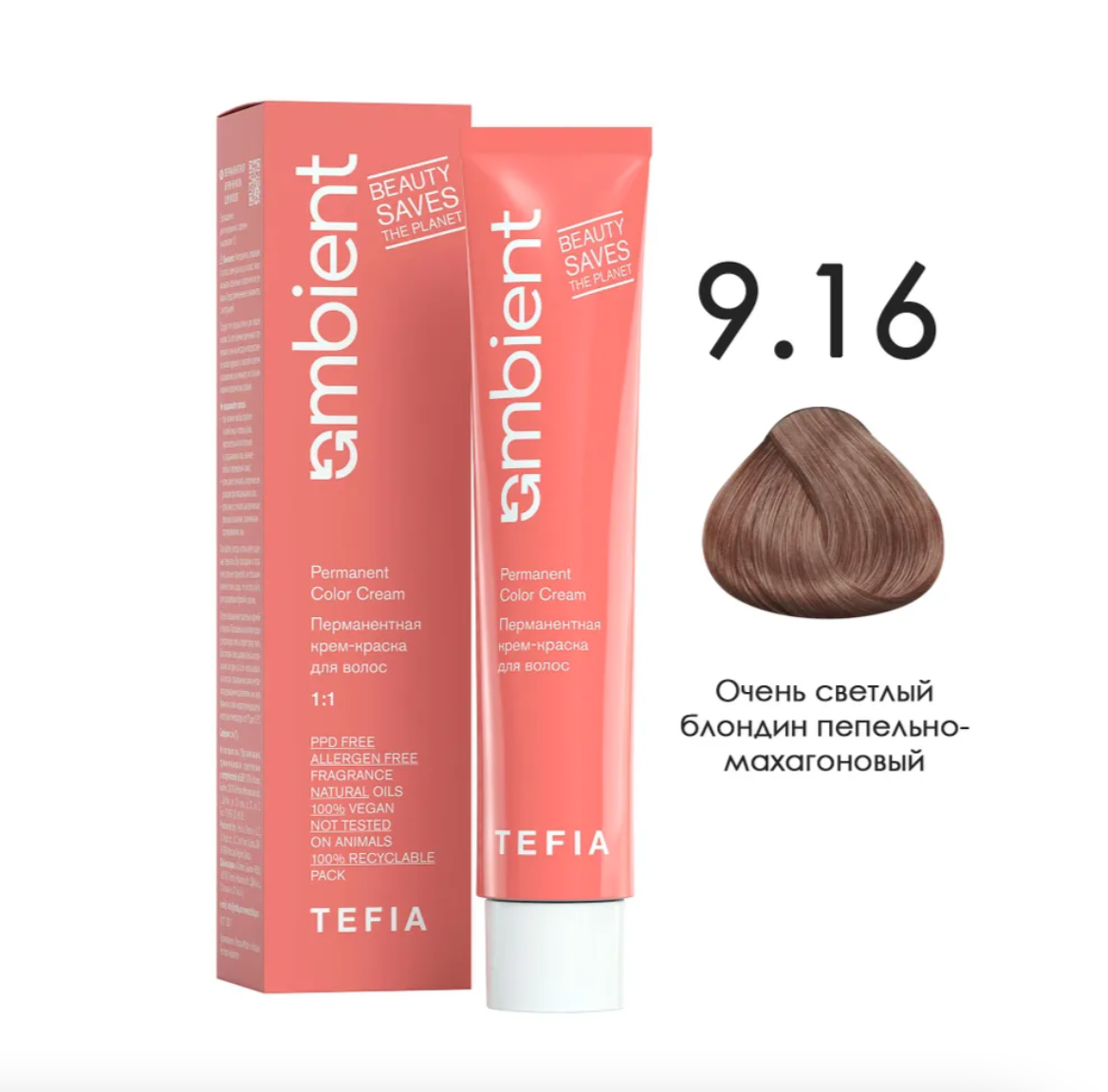 - TEFIA AMB Крем-краска 9.16 Очень светлый блондин пепельно-махагоновый, 60 мл.