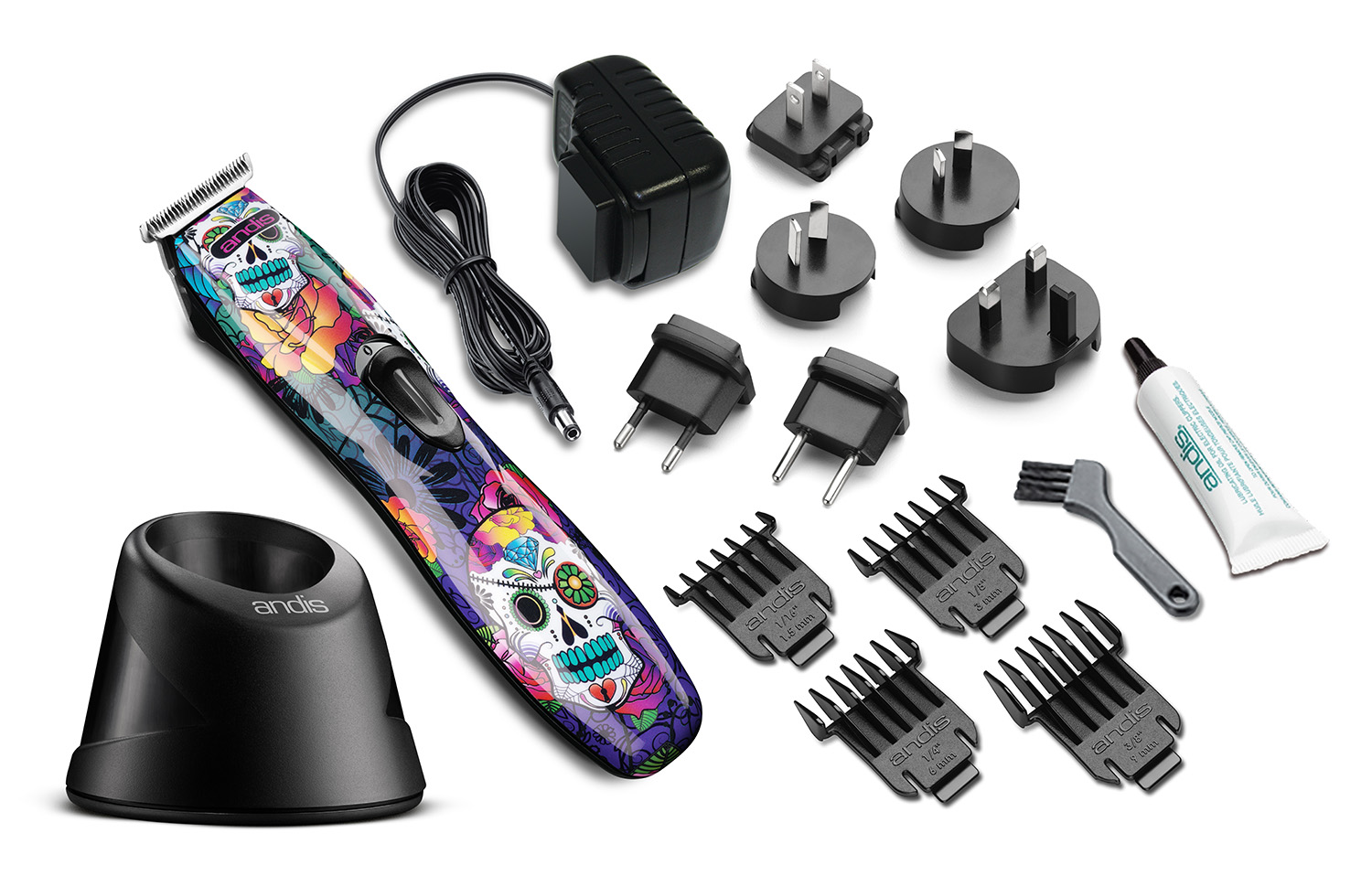 Комплектация: Триммер для стрижки Andis Slimline Pro Li D8 Sugar Skull; Станция для зарядки триммера; Сменные пластиковые насадки 4 шт.: №0 (1/16") 1.5 мм, №1 (1/8") 3 мм, №2 (1/4") 6 мм, №3 (3/8") 10 мм; Масло для смазки ножевого блока 7,5 мл.; Щетка для чистки машинки; Техническая документация; Переходник под розетку евростандарта.