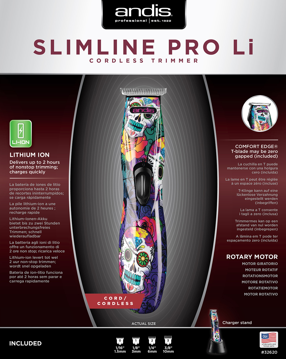 Профессиональный триммер с комбинированным питанием Andis D-8 Slimline Pro Li Sugar Skull 32620 преимущества и особенности: