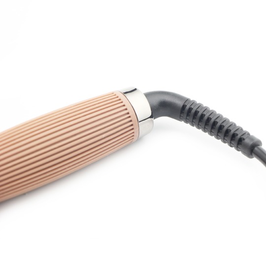 - Ручка, покрытая специальным материалом, устойчивым к различного рода повреждениям, удобно ложится в руку. Ее ребристая поверхность способствует удобному пользованию плойкой.