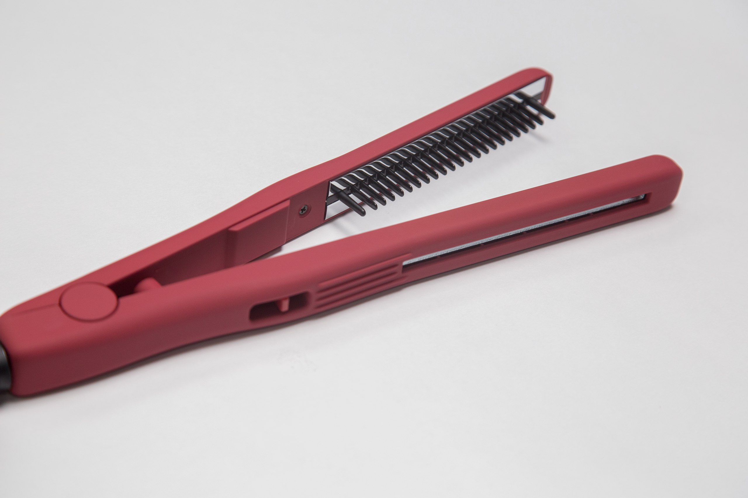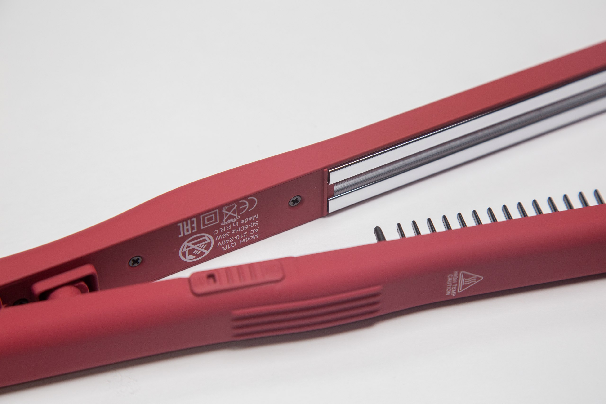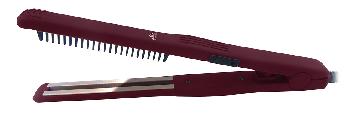 Длина утюжка - 25 см. Длина рабочей поверхности пластин утюжка - 11 см. Ширина пластин - 1,8 см. Расческа с турмалиновым покрытием. Покрытие корпуса Soft Touch Pro. Кнопка фиксации полотен. Зеркальное титановое покрытие расчески-утюжка обеспечивает равномерный нагрев и качественное скольжение. Подходит для укладки волос коротких и средних, а так же для укладки усов и бороды.