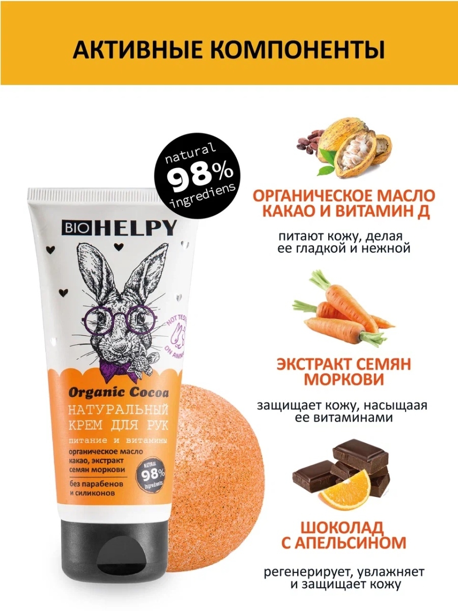 Натуральный крем с органическим маслом какао и Д-пантенолом - увлажняет кожу, делает ее гладкой и нежной. Экстракт семян моркови - защищает и витаминизирует эпидермис.