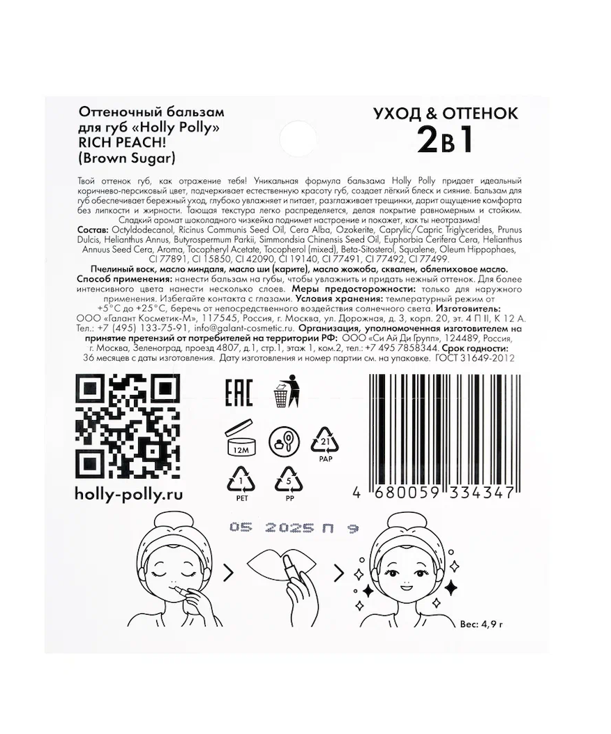 Уникальная формула бальзама Holly Polly придает идеальный коричнево-персиковый цвет, подчеркивает естественную красоту губ, создает лёгкий блеск и сияние.