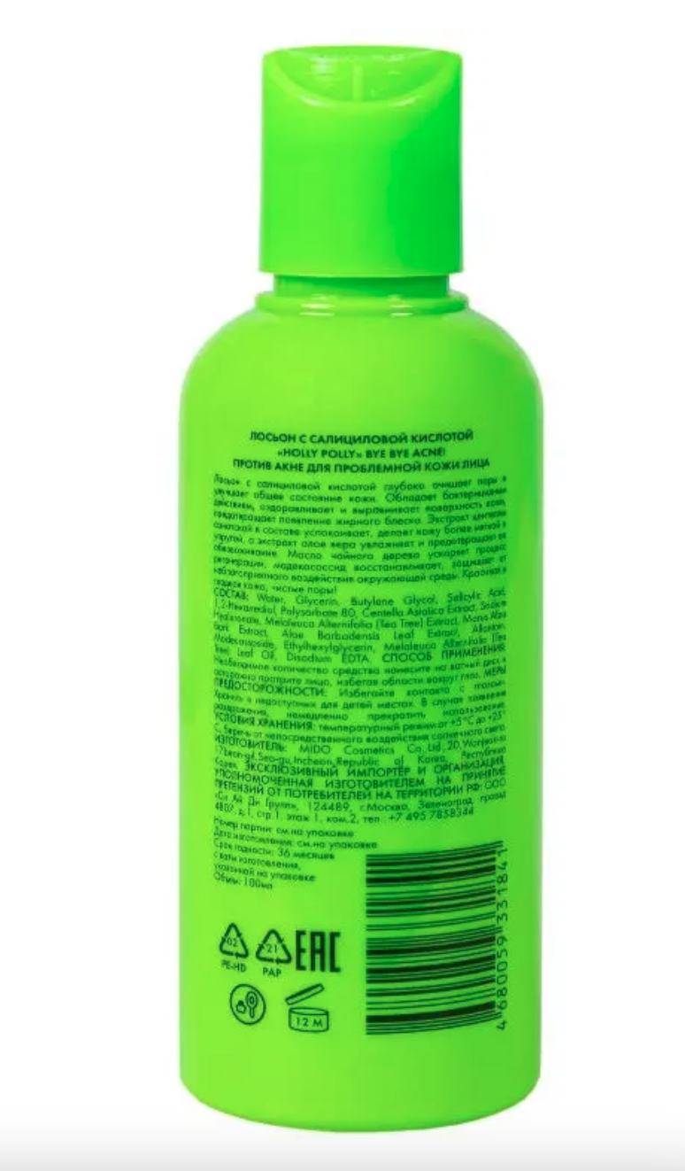 Способ применения: Нанесите лосьон на ватный диск, протрите лицо, предварительно очистив кожу пенкой для умывания лица Holly Polly Bye Bye Acne! против акне и воспалений.
