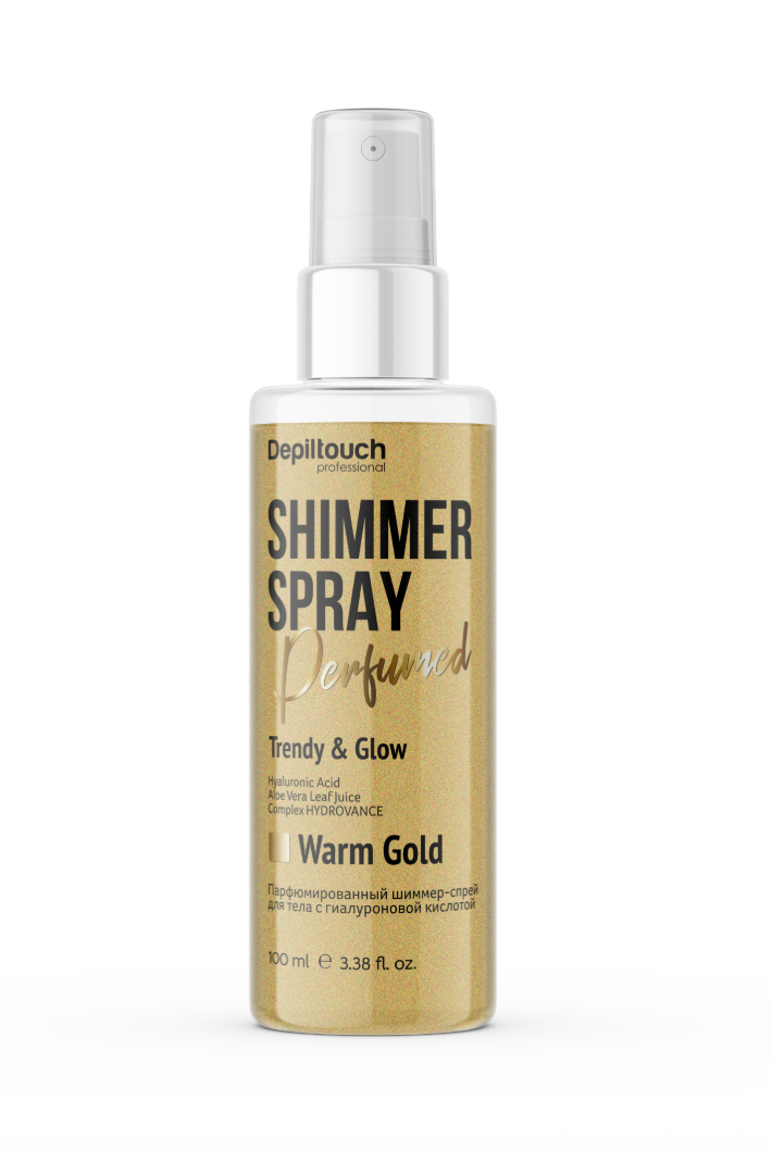 Depiltouch Professional Шиммер-спрей для тела парфюмированный с гиалуроновой кислотой, оттенок теплое золото - тонизирует и увлажняет кожу, содержит натуральный светоотражающий шиммер-мику, визуально выравнивает микрорельеф кожи и придает ей мягкое сияние, обеспечивает легкий лифтинг и "шелковый" эффект.